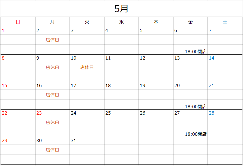 5月店休日のお知らせ